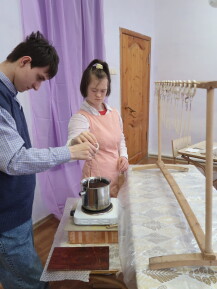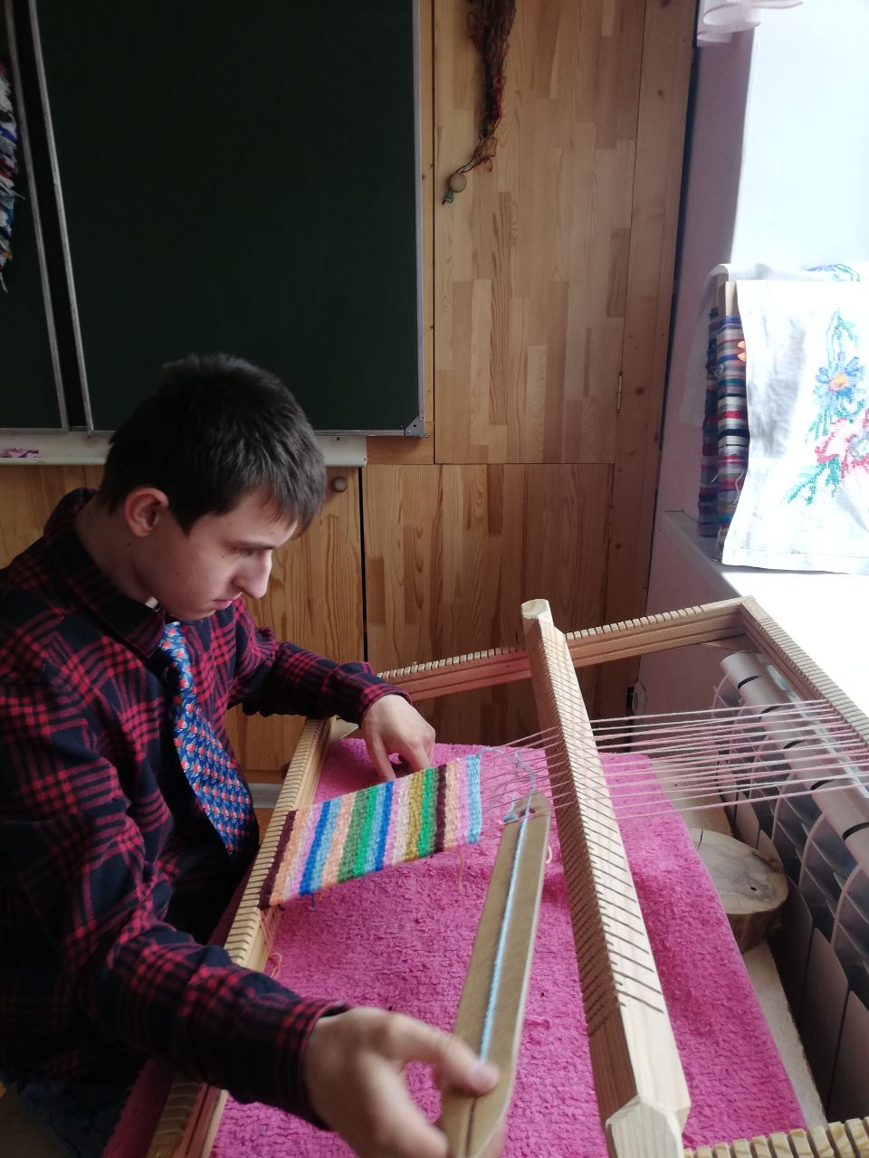 Работа в ткацкой мастерской очень нравится не только девушкам. Это творческий процесс. Создание целого полотна из отдельных цветных ниток приносит успокоение и наполненность. Работа на ткацких станках способствует развитию крупной моторики и концентрации внимания. Воспитанник начинает лучше осознавать и понимать своё тело, свои движения.